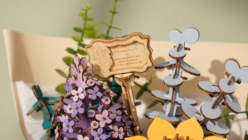 Un hermoso ramo de flores de madera para armar sin pegamento, ideal para disfrutar un momento creativo y regalar una pieza decorativa que perdura en el tiempo.
